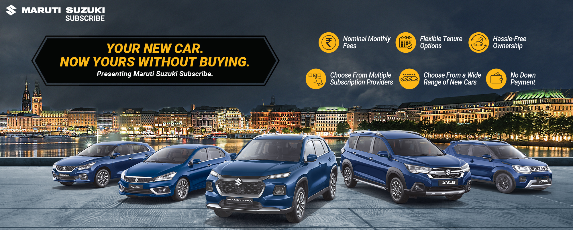 Maruti Suzuki Subscribe enables all customers to enjoy driving their preferred Maruti Suzuki cars without having to deal with all the financial responsibilities that come with owning a car.All you need to do is opt for a monthly subscription plan at a fixed monthly fee, which includes the routine maintenance and insurance costs, and choose a flexible tenure. At Kalyani Motors in, Chamarajanagara, Sathyamangala Road, all Hatchback, Sedan, SUV, the MUV models line-up includes Baleno, Invicto, EVitara, Jimny, Ciaz, Ignis, Fronx, Grand Vitara, XL6. Here, you will enjoy Maruti Suzuki Subscribe benefits such as: